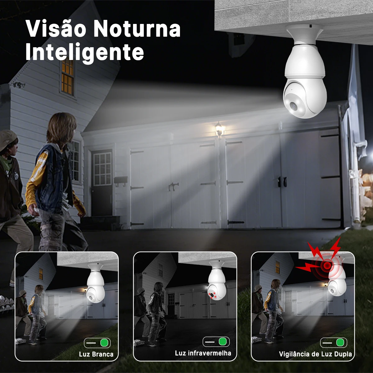 A câmera conta com modo de visão noturna, garantindo monitoramento mesmo em ambientes com pouca ou nenhuma iluminação.