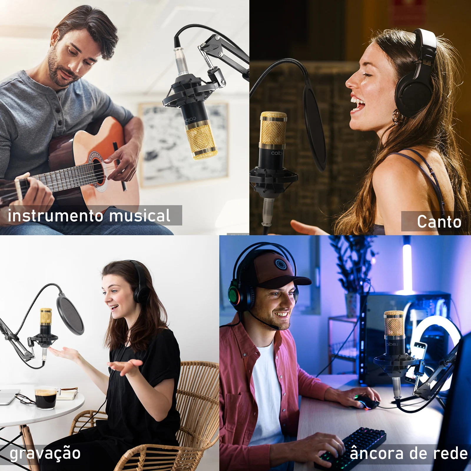 Tenha áudio mais limpo, potente e profissional com o Microfone Condensador com Kit para Transmissão ao Vivo, ideal para streamers, criadores de conteúdo, gamers, podcasts e home office. Um kit completo para elevar a qualidade do seu som desde o primeiro uso.